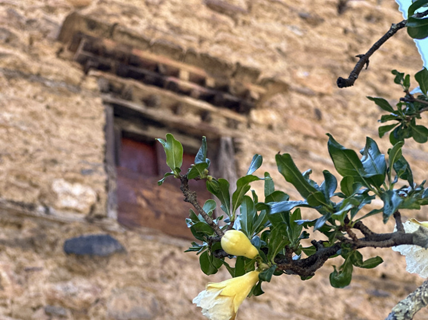 彩色鋪裝的通村路兩邊,成片的苞谷林正在背紅纓,風中響著緊密結實的聲音。各種果木枝繁葉茂,結滿了寶石般紅紅綠綠的果子。一排柴垛上方,伸出很大一片橙色的小果子,沒有葉子,我們像賞花一樣欣喜于它的紅艷。嘉絨姑娘悄默地走在我們身邊,她的手里擺弄著一片草葉,安靜而美好,是感到這一路上的莊稼果木已經足夠繁盛。