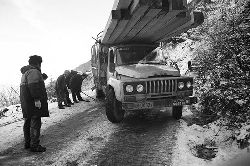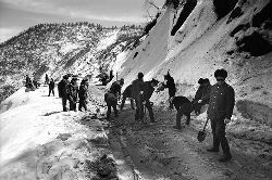 “二呀二郎山, 高呀高萬丈, 古樹荒草遍山野, 巨石滿山崗。 康藏交通難行走, 康藏交通被它擋…… 五十年代初,《歌唱二郎山》傳遍中外,二郎山因此而聞名四海。歌詞也是昔日二郎山的真實寫照?!?br />  一九九七年十一月二十四日,連續(xù)多日大雪,把整個二郎山裹得嚴(yán)嚴(yán)實實,白茫茫一片。陣陣山風(fēng)吹過,大霧就像瀑布一樣,從山頂直往下翻涌傾瀉。 一大早,州交通局打冰除雪排險的干部職工就從二郎山管理站直奔山埡口。載有防滑砂的大貨車穿迷霧,繞山梁,向山頂埡口疾馳。由于氣溫太低,霧又大,車上的擋風(fēng)玻璃很快就結(jié)下了冰,路面打滑非常嚴(yán)重。前面車輛堵了起來,排險人員只好下車步行。 大霧彌漫,能見度很底,陰霾的天空又飄起了紛紛揚揚的雪花,剌骨的寒風(fēng)陣陣襲來,只聽見車蓬布在風(fēng)中“嗶剝”作響,卻看不見前面到底堵了多少車。排險人員只好相互攙扶踩著冰滑的邊路艱難地向行。好不容易來到堵在最前面的車子面前。原來是一輛載著原木的東風(fēng)牌大貨車側(cè)滑在公路上,把整個公路堵死了。 局領(lǐng)導(dǎo)當(dāng)即指揮大家用鋼釬、鐵鎬和鋤頭處理冰道,沒有撮箕,大家借來加水桶裝運冰雪……氣溫仍在急劇下降,剛從雪堆里刨出來的路,又被結(jié)起一層冰,就像地面上澆上了油,這就是冰雪道上有名的“桐油凌”。 有二位老同志不顧年老體弱,積極參與打冰除雪,一個在打冰時,被彈起的冰碴把腦門劃了一個口子,鮮血直往外冒。有人想幫他包扎,他堅決不干,自己就用手帕按住,把帽子向下拉蓋住傷口就算了。血從手帕中浸透出來,與眉毛上的冰凌結(jié)在一起。氣溫太低,冰層太厚,十字鎬每挖一下,多數(shù)情況下也就是挖下一個白點而已。不一會兒,另一位老同志已是滿頭大汗,大家勸他休息一下,他卻說:趁著現(xiàn)在雪不是太大,早點把主道上的冰雪多除點,過往二郎山的車輛就多一份安全。 排險人員的手凍紅了,刨冰雪碰傷的指頭還流著鮮血,身上蒸發(fā)的熱氣,把衣領(lǐng)口、袖子口和褲子口結(jié)成了冰,可是,誰也沒有吭一聲。 ……受堵車輛終于向前開動了。 風(fēng),越刮越猛,雪,越來越大。 防滑車在冰雪道上艱難地向前爬行著,車箱上面的職工們揮舞的洋鏟向路面撒著防滑砂。一路上風(fēng)絞雪,防滑車象一頭不聽使喚的牛,顛簸、亂竄,好不容易才來到260(二郎山最險處),對這里“桐油凌”路面進行重點防滑處理后,防滑車又返回來,開始向山頂進發(fā)……風(fēng)雪二郎山上打冰除雪、防滑排險,看似沒有驚天動地的壯舉,身臨其景才知其艱難辛苦。難怪當(dāng)年每每經(jīng)過二郎山冰天雪地奇險路段的車,都會向風(fēng)雪中屹立路邊的交通系統(tǒng)排險保暢通的職工們鳴笛致敬,風(fēng)雪中的那份情彌足珍貴。 川藏線上的老司機傳下來一首傷心的順口溜:“車過二郎山,如闖鬼門關(guān),萬幸不翻車,也要凍三天!”其險峻實為罕見,尤其是途經(jīng)二郎山260(公路公樁)處,曾被淡虎色變的人稱為“鬼招手”的險路段。 1983年1月3日,有著安全行車44萬公里記錄的一位駕駛員開著輛嶄新的東風(fēng)牌貨車,同行還有兩名職工,夜行二郎山,在彌天大霧中神秘地“失蹤”了。十五天后,搜山的人才用望遠鏡看到260公里路樁處的山崖下,有一塊汽車破篷布掛在樹枝,猶如招魂的凄厲幌幡在冷風(fēng)中招搖晃動。鋼纜繩吊著搜山的人下到崖下400米深處的谷底。扒開一座座雪堆,叫人汗毛倒豎:雪堆下,盡是廢大梁、爛車廂、銹車頭和支離破碎的汽車,足有一個汽車連!一輛不知埋了多久的卡車廂里牛肉已腐爛,駕駛室里坐著三具發(fā)黑的僵尸……其狀慘不忍睹!