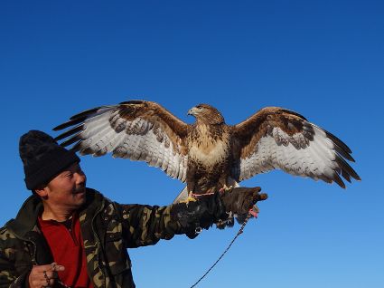 “小一點(diǎn)的鷹好訓(xùn),訓(xùn)老一點(diǎn)的叫熬鷹。 開(kāi)始熬鷹前,一次性喂飽鷹,七天七夜不吃不喝不睡覺(jué),待七天時(shí)到,放鷹于空,手中拿肉,用我們倆特殊的交流方式指揮它,這時(shí)它會(huì)落我的手臂上。但是,這一只始終沒(méi)服過(guò)我。訓(xùn)出來(lái)一只大約半月左右。”訓(xùn)鷹人說(shuō)。