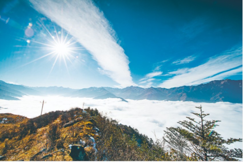 在阻隔灣壩通往外域的山脈中,有一個地方名為小卡子。一條簡易的林區(qū)便道通往那里。從這條便道穿越峽谷的最陡處,越過林線的高度,最終將會馳上一條刀刃狀的山脊。脊的兩側(cè),西為著名的大雪山、貢嘎山,東為令牌山、則爾山。這條山脊的海拔在5000米左右,這是足以傲視群山的高度,而且恰恰又是云層頂端的高度。常常溝底陰云低罩,山腰云霧繚繞。到了山脊,天空頓時空闊遼遠(yuǎn),艷陽高照,而山脊的兩側(cè),云海飄渺,宛若仙境。而遠(yuǎn)處的山巒大多又在云層之上,峰高云低,如孤島浮舟。