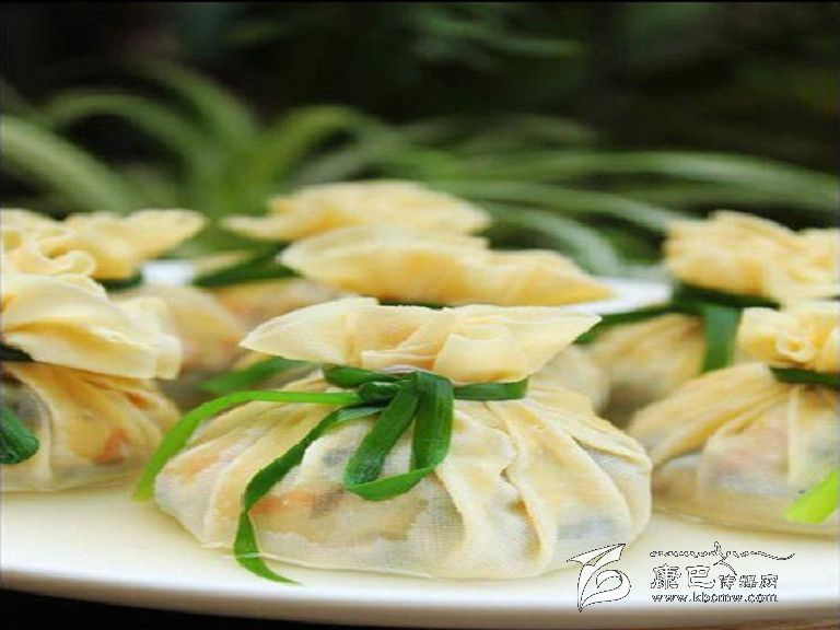8、韭菜在熱水中燙一下,過涼開水,系在燉好的八寶錢袋上做下裝飾即可