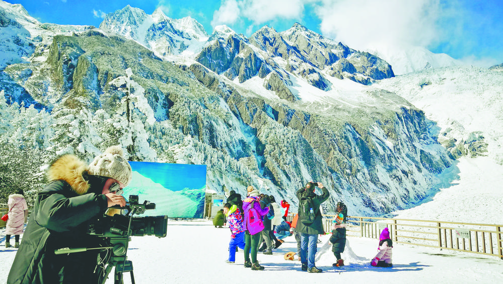游客在海螺溝景區(qū)拍攝。