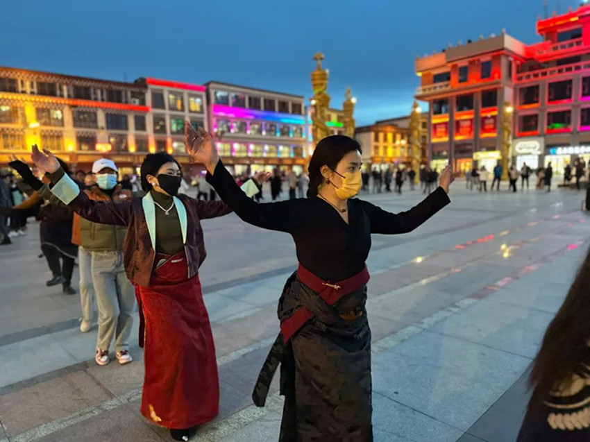 本網(wǎng)訊 每到傍晚時(shí)分,色達(dá)的金馬廣場(chǎng)上都會(huì)準(zhǔn)時(shí)響起起歡快的鍋莊曲。 舞者們雙手隨音樂(lè)自然張開(kāi),邁著輕快的步伐,踢腿、揚(yáng)手、轉(zhuǎn)圈。游客們有的拿起手機(jī)拍照留念,有的則加入鍋莊舞的隊(duì)列。