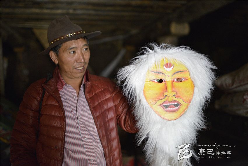 午飯后,洛絨丹巴帶我到離家不遠(yuǎn)的一個(gè)小院,推開底樓嘎吱作響的木門,借助外面的光亮,看見有幾個(gè)巨大的鐵皮箱。洛絨丹巴打開一口箱子,不想里面整齊地放著各種戲服;第二口箱子是頭飾,唐朝文成公主的、清朝皇帝的。這些服裝和頭飾多是模仿電視電影,或者加上想象自己制作的,個(gè)別是外地方買回的。最具特色是第三口箱子,用牛皮制作的各種面具、表情十分夸張,有和善的、猙獰的、威風(fēng)的,神情各異。面具的顏色各種各樣,白色、黑色、黃色、紅色等。眼睛和嘴巴處挖了窟窿,有的還在面具外圍綴了一圈羊毛。洛絨丹巴指點(diǎn)著各種顏色的面具介紹:白色代表純潔、紅色代表威嚴(yán)、黃色代表吉祥;巫女則半黑半白,象征其兩面三刀的性格;青面獠牙代表妖魔。說起這些他如數(shù)家珍。