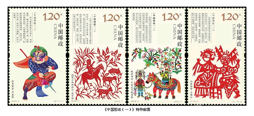 2018年1月24日,中國(guó)郵政發(fā)行《中國(guó)剪紙(第一組)》特種郵票,全套4枚。這是中國(guó)郵政繼1959年1月1日發(fā)行的《剪紙》特種郵票59年后重新發(fā)行的《中國(guó)剪紙》系列郵票。全系列郵票計(jì)劃發(fā)行4組,每組4枚。這次發(fā)行的第一組4枚郵票入選內(nèi)容分別是被列入第一批國(guó)家級(jí)非物質(zhì)文化遺產(chǎn)名錄的北方四處剪紙傳承人的作品:第一枚“河北蔚縣·蘆花蕩”,河北蔚縣剪紙歷史悠久,風(fēng)格獨(dú)特,題材多取自于人物,造型設(shè)計(jì)疏密有致,點(diǎn)染絢麗鮮艷。此幅作品作者王老賞(1890-1951),河北省蔚縣南張莊村人;第二枚“內(nèi)蒙和林格爾·牧羊圖”,內(nèi)蒙古和林格爾剪紙多反映游牧生活,具有古拙浪漫、質(zhì)樸奔放、熱情率真的藝術(shù)風(fēng)格。此幅作品作者張花女 (1903-2004),和林格爾縣董家營(yíng)鄉(xiāng)曹老八夭村人;第三枚“陜西旬邑·江娃拉馬梅香騎”,陜西旬邑的彩色剪紙具有民間美術(shù)的鮮活靈動(dòng),無拘無束,形象稚拙而又鮮明,構(gòu)圖緊密完滿而又單純明快,色彩對(duì)比強(qiáng)烈而又協(xié)調(diào)適度。此幅作品作者庫(kù)淑蘭(1920-2004),陜西咸陽(yáng)市旬邑縣張洪鎮(zhèn)赤道鄉(xiāng)富村人;第四枚“山西新絳·小別母”,山西新絳剪紙藝術(shù)源遠(yuǎn)流長(zhǎng),內(nèi)容豐富多彩,尤以人物見長(zhǎng),戲曲題材作品更為突出,構(gòu)圖簡(jiǎn)潔飽滿、精煉極致,粗獷中見典雅,簡(jiǎn)煉而不簡(jiǎn)單。此幅作品作者蘇蘭花(1906-1995),山西運(yùn)城市新絳縣澤掌鎮(zhèn)北蘇村人。