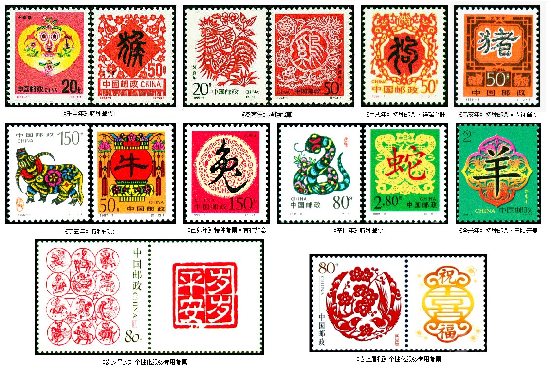 剪紙作為藝術(shù)百花園中的一朵奇葩,在我國(guó)郵票圖案設(shè)計(jì)中應(yīng)用也非常廣泛。由于傳統(tǒng)的民間剪紙有著濃郁的吉祥喜慶氣氛,因此在我國(guó)近些年發(fā)行的生肖郵票中多次出現(xiàn)剪紙藝術(shù)。在第二輪12套24枚生肖郵票中的剪紙圖案分別有1992年《壬申年》的“猴桃獻(xiàn)瑞”和“喜鵲登梅”、1993年《癸酉年》的“雄雞報(bào)曉”和“四季吉祥”、1994年《甲戌年》的第二枚“祥瑞興旺”、1995年的《乙亥年》的第二枚“喜迎新春”、1997年的《丁丑年》的“金牛奮蹄”和“牛耕年豐”、1999年《己卯年》的第二枚“吉祥如意”、 2001年《辛巳年》的“祥蛇祝?!焙汀跋檫\(yùn)普照”以及2003年的《癸未年》第二枚“三陽(yáng)開泰”等。這些郵票中剪紙圖案有的直接取材于民間,有的則是在原作基礎(chǔ)上再創(chuàng)作。如“雄雞報(bào)曉”一枚,圖案選用的是河北省獻(xiàn)縣本齋鄉(xiāng)鄧家莊蔡蘭英老人的剪紙“百雞圖”中的一幅,而“金牛奮蹄”一枚,圖案是根據(jù)山東高密民間藝人齊秀花的剪紙“媳婦騎?!痹偌庸?chuàng)作而成的。在我國(guó)發(fā)行的祝福系列個(gè)性化服務(wù)專用郵票中也有吉祥喜慶的剪紙圖案,即2005年11月6日的《歲歲平安》和2005年11月11日的《喜上眉梢》等。