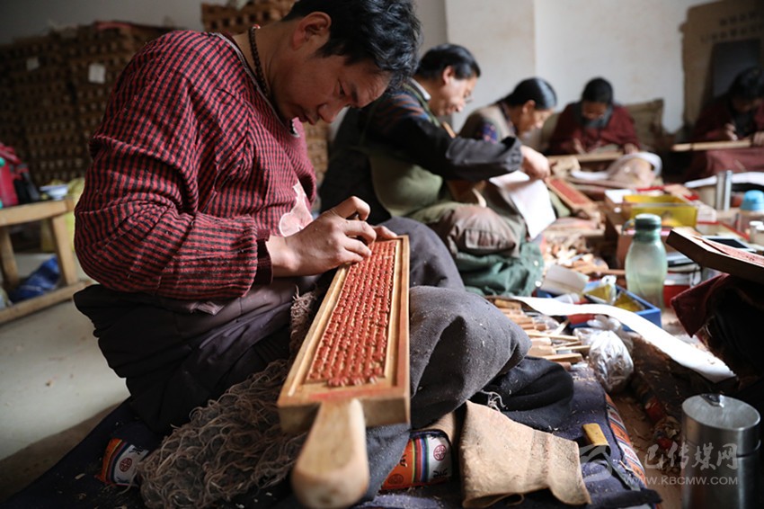 德格籍雕刻工匠格絨介紹說:“這是一項技術(shù)活,所有的文字都需要反刻在紅樺木上,我們大概六到七天能完成一塊經(jīng)板的雕刻。雕刻完成后還要經(jīng)過五次的校對,有錯的進(jìn)行再次校刻,最后在雕刻好的經(jīng)板上涂上酥油晾曬,一塊復(fù)刻經(jīng)板才算完成?!?/span>