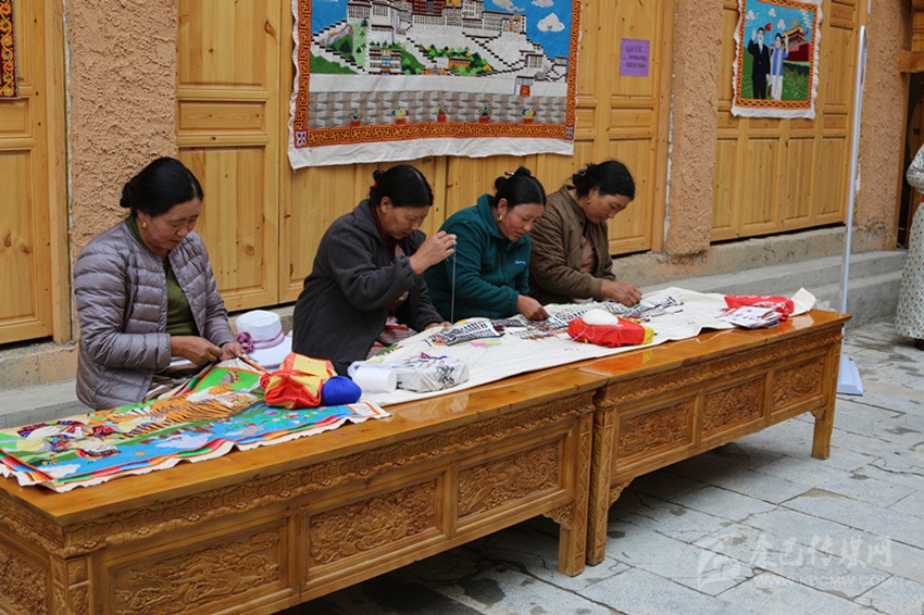 在藏繡展點(diǎn),5名農(nóng)牧民婦女正在合繡一幅藏族建筑刺繡作品?!拔覐?6歲開(kāi)始跟著父親學(xué)藏繡,傳到我這已經(jīng)是第四代了。除了‘六長(zhǎng)壽’、度母像等傳統(tǒng)圖案,今年是新中國(guó)成立70周年,我還繡了一幅天安門(mén)作品。”47歲的傳承人達(dá)打介紹道。