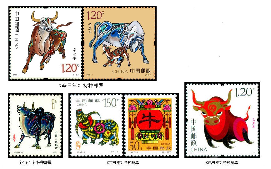 1997年1月5日發(fā)行第二輪生肖郵票中的“牛票”,即《丁丑年》特種郵票,全套2枚。由郵票設計師呼振源設計。第一枚“金牛奮蹄”,畫面依據(jù)山東省高密縣方市鄉(xiāng)前曹戈莊村當時33歲的農(nóng)村女子齊秀花的剪紙作品《媳婦騎牛圖》進行設計,原作中的“媳婦”被刪去,突出了牛的形象,體現(xiàn)出膠東地區(qū)民間剪紙藝術源于生活、構思巧妙、粗獷中多見細膩的本色。只見那彎彎的牛角,垂地的長尾,壯實的牛身,穩(wěn)健的四蹄,都真實地再現(xiàn)了生活中牛的特點,牛身上似花非花,似銅錢又非銅錢的紋飾,充分地表現(xiàn)出樸實的浪漫主義。第二枚“牛耕年豐”,畫面主圖為一只高高掛起的大紅燈籠上,映出了一個醒目的隸書“牛”字,為牛年的慶春象征。圍繞著這只燈籠,又進行了幾多創(chuàng)意,兩只喜鵲和一朵梅花,喻意“喜鵲登梅”;旒蘇上的兩朵牡丹,代表幸福、富貴;特別是那春意盎然的“雙牛圖”,畫面雖小,確為點睛之筆,與主圖的大“?!弊志o密呼應。