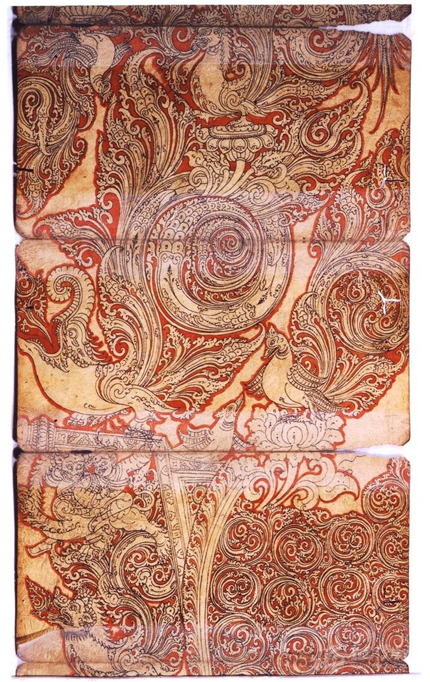 (二)裝飾圖案化:藝術(shù)中的“希臘化”過(guò)程,蔓延到南亞地區(qū),已是“強(qiáng)弩之末”。故南亞美術(shù)受到希臘藝術(shù)的影響,但是并不徹底。所以在表現(xiàn)物象體積和空間的時(shí)候,顯得力不從心,往往是想寫實(shí)的物象表現(xiàn)成裝飾性的圖案,時(shí)間一長(zhǎng),便演變成為南亞的審美傳統(tǒng)。比如各種動(dòng)物和植物紋樣,以及卷草紋、連珠紋等。尼瓦爾唐卡中的人物、動(dòng)物、植物和事物大多通過(guò)精美的、圓弧組成的各種裝飾圖案來(lái)表現(xiàn)。