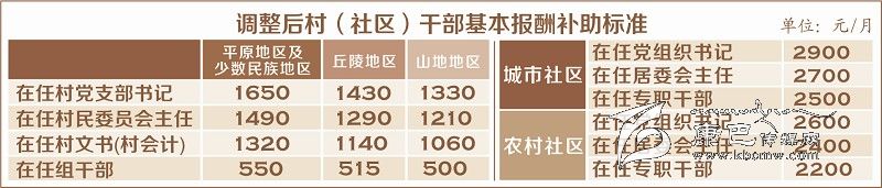 調(diào)整后具體標(biāo)準(zhǔn)為:平原地區(qū)及少數(shù)民族地區(qū),在任村黨支部書記、村民委員會主任、村文書(村會計(jì))、組干部,分別為每人每月1650元、1490元、1320元、550元;丘陵地區(qū)分別為每人每月1430元、1290元、1140元、515元;山地地區(qū)分別為每人每月1330元、1210元、1060元、500元。