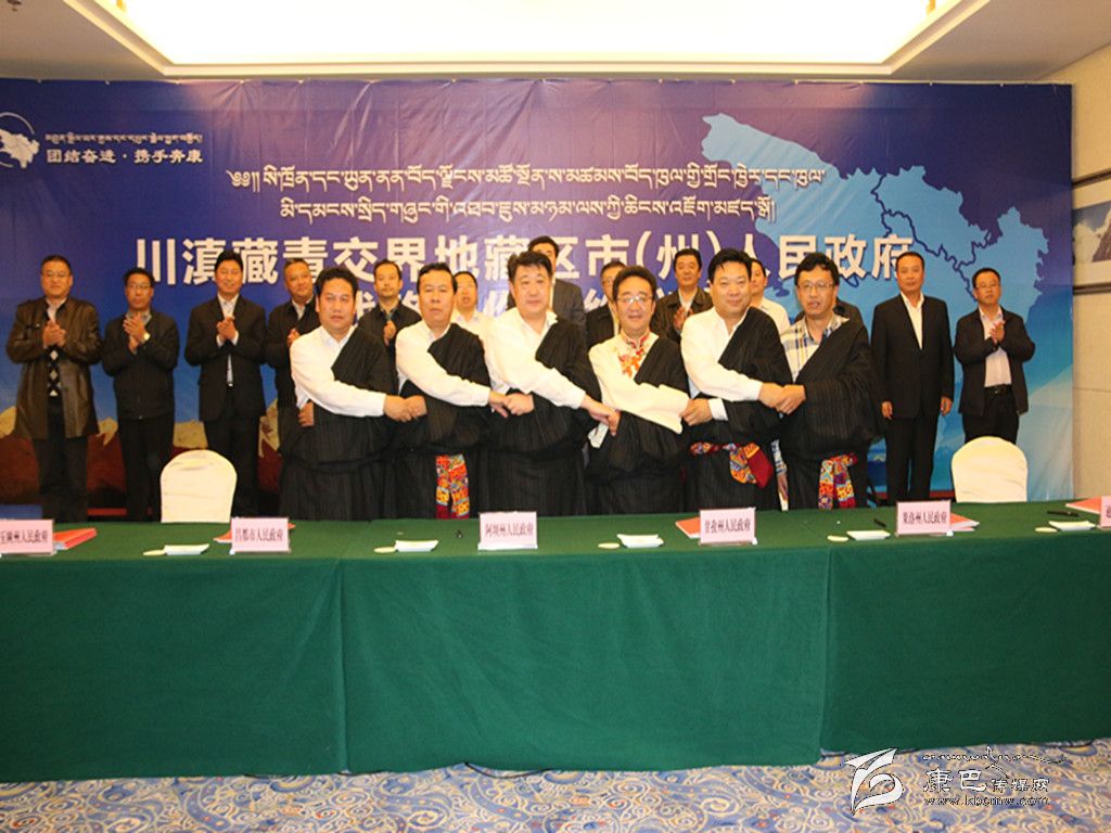 隨著川滇藏青交界地藏區(qū)市(州)長聯(lián)席會議制度的建立,交界地藏區(qū)的合作由過去“點對點”的雙邊合作上升為“抱成團”的多邊合作。圖為簽約儀式現(xiàn)場。