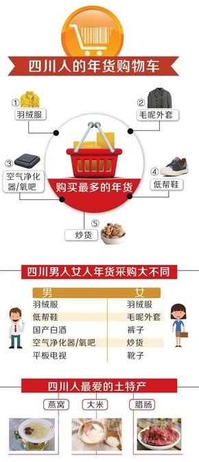 還有幾天就過年了,你們家買了哪些年貨?近日,電商平臺(tái)阿里巴巴和京東先后推出了年貨大數(shù)據(jù)。從這些數(shù)據(jù)中,我們能看到一個(gè)典型成都人的年貨網(wǎng)絡(luò)購物車是這樣的:購買最多的年貨還是衣服,其中羽絨服、毛呢外套是成都人的最愛;家電和電子產(chǎn)品愛買空氣凈化設(shè)備和玫瑰金iPhone7手機(jī);食品是山核桃等炒貨,以及國產(chǎn)白酒。在女性偏好酒水消費(fèi)的排名中,四川女性排名第五。