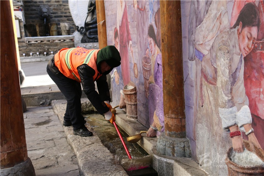每逢節(jié)假日,是環(huán)衛(wèi)工人最忙最累的時候。2月5日下午,康定強盛公司清洗組組長楊曉康帶著全組工作人員來到康定市水井子,打掃整個水井子的環(huán)境衛(wèi)生?!俺跻弧畵岊^水’是多年來康定市民的過年習俗,我們現(xiàn)在把這里打掃干凈,讓市民們在‘搶頭水’時有干凈整潔的環(huán)境?!睏顣钥蹈嬖V記者。