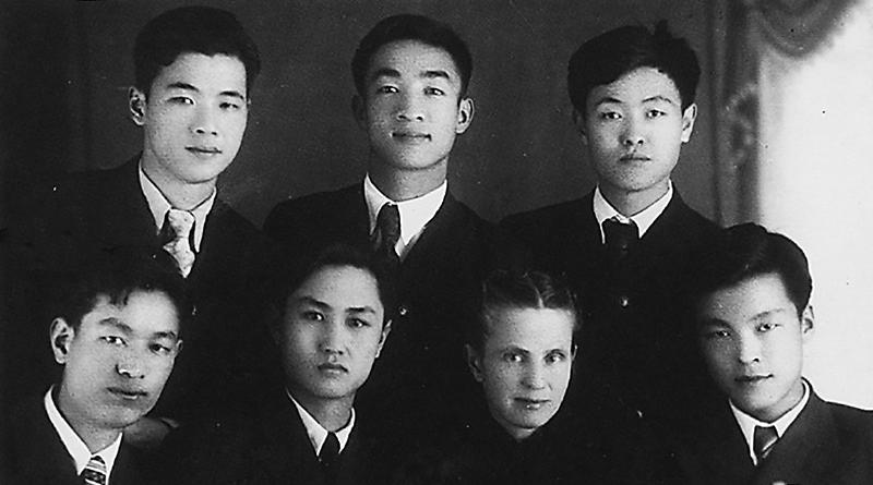 • 1949 年 6月1日,李鵬同志(后排左)在蘇聯(lián)伊萬諾沃動(dòng)力學(xué)院補(bǔ)習(xí)數(shù)理化及俄文時(shí)與俄語教師費(fèi)德洛娃(前排左三)及同學(xué)合影。 新華社發(fā)