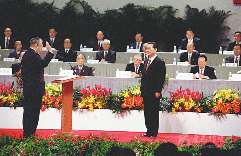 1997年7月1日凌晨,中華人民共和國香港特別行政區(qū)成立暨特區(qū)政府宣誓就職儀式在香港會(huì)議展覽中心新翼七樓隆重舉行。香港特區(qū)首任行政長官董建華宣誓就職,李鵬同志監(jiān)誓。 新華社記者 劉建國 攝