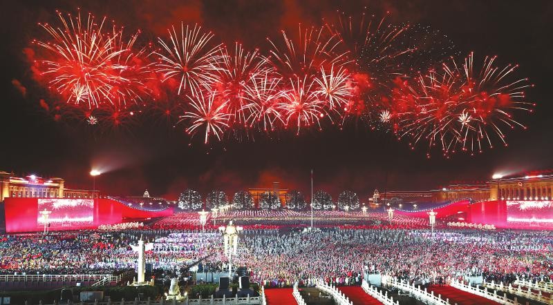 此刻,萬花綻放,“人民萬歲”造型照亮廣場,照亮每個(gè)人的臉龐。