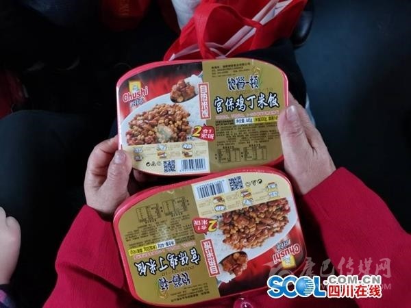 18日中午12時, 列車出發(fā)2小時后,巴中恩陽人鄔兵領到了來自家鄉(xiāng)的午餐——一盒自熱米飯,配菜是宮保雞丁。“不錯不錯,今年不用吃方便面了?!倍松厦罪埖泥w兵笑了笑。