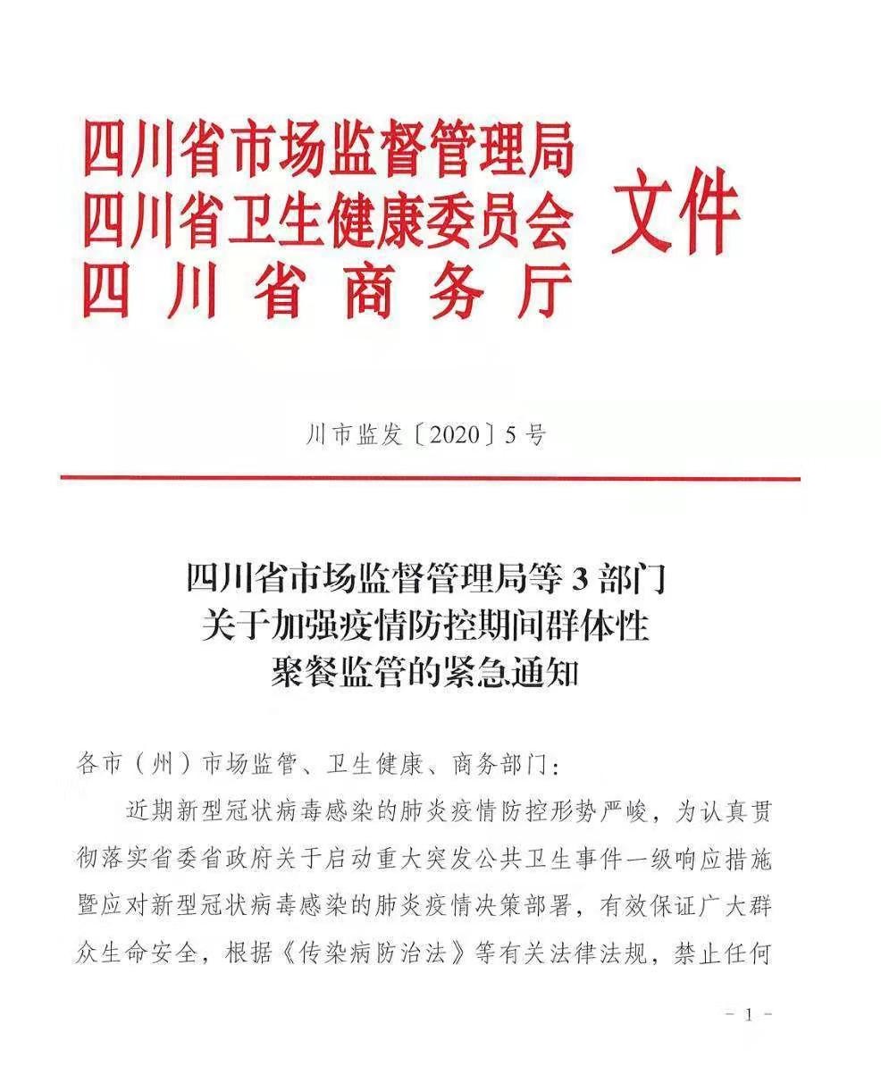 四川新聞網(wǎng)成都1月25日訊(記者 李丹)1月25日,四川省市場(chǎng)監(jiān)督管理局、四川省衛(wèi)生健康委員會(huì)、四川省商務(wù)廳3部門(mén)聯(lián)合發(fā)布緊急通知,近期新型冠狀病毒感染的肺炎疫情防控形勢(shì)嚴(yán)峻,為認(rèn)真貫徹落實(shí)省委省政府關(guān)于啟動(dòng)重大突發(fā)公共衛(wèi)生事件一級(jí)響應(yīng)措施暨應(yīng)對(duì)新型冠狀病毒感染的肺炎疫情決策部署,有效保證廣大群眾生命安全,根據(jù)《傳染病防治法》等有關(guān)法律法規(guī),禁止任何餐飲單位和個(gè)人舉辦任何形式的群體性聚餐活動(dòng),已經(jīng)訂餐的應(yīng)盡快取消或延期舉辦。