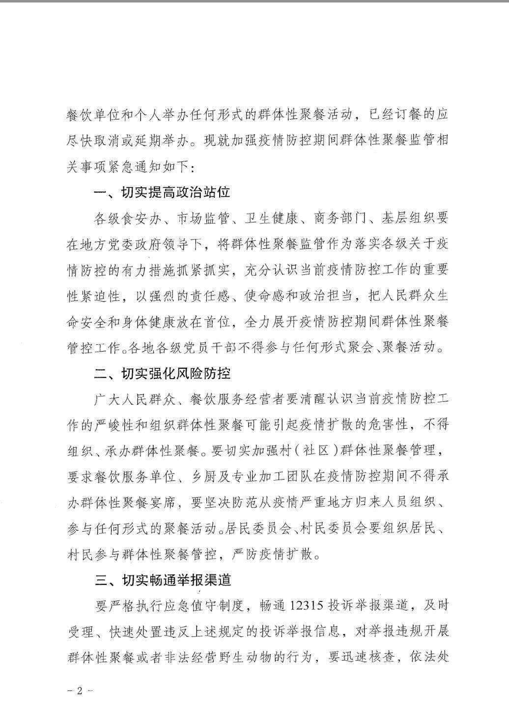 各級(jí)食安辦、市場(chǎng)監(jiān)管、衛(wèi)生健康、商務(wù)部門(mén)、基層組織要在地方黨委政府領(lǐng)導(dǎo)下,將群體性聚餐監(jiān)管作為落實(shí)各級(jí)關(guān)于疫情防控的有力措施抓緊抓實(shí),充分認(rèn)識(shí)當(dāng)前疫情防控工作的重要性緊迫性,以強(qiáng)烈的責(zé)任感、使命感和政治擔(dān)當(dāng),把人民群眾生命安全和身體健康放在首位,全力展開(kāi)疫情防控期間群體性聚餐管控工作。各地各級(jí)黨員干部不得參與任何形式聚會(huì)、聚餐活動(dòng)。