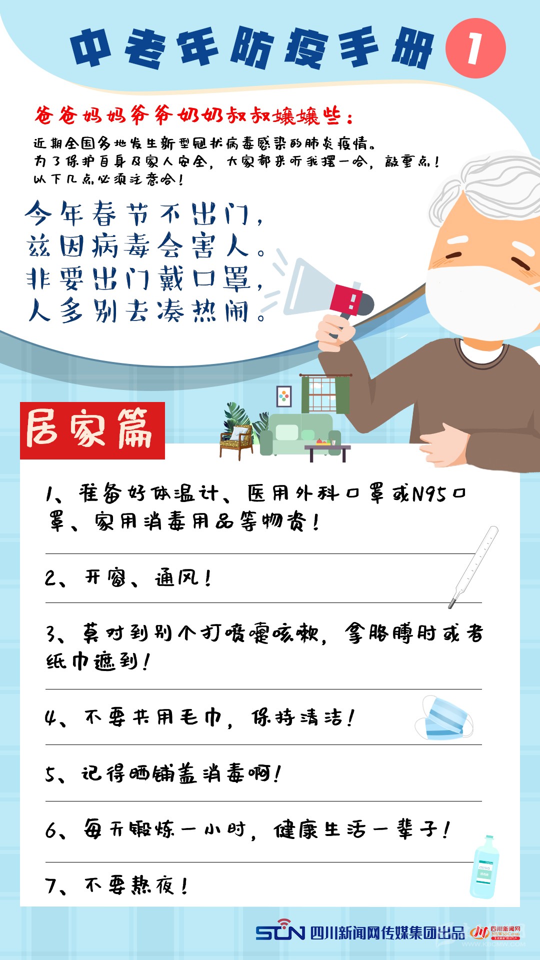 對(duì)此,為了讓“這屆難帶的父母”進(jìn)一步認(rèn)識(shí)新型冠狀病毒感染的肺炎疫情,四川新聞網(wǎng)特別推出《中老年防疫手冊(cè)》,呼吁老年人重視疫情,科學(xué)防控,做好自己健康的第一責(zé)任人。還在等什么,快轉(zhuǎn)給你那“倔強(qiáng)”的父母吧!