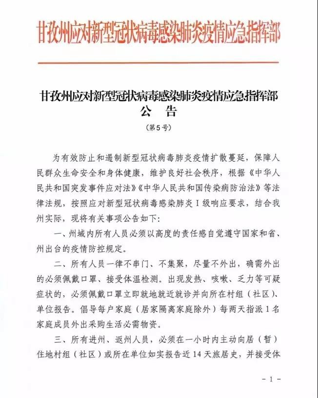 甘孜州應(yīng)對(duì)新型冠狀病毒感染肺炎疫情為有效防止和遏制新型冠狀病毒肺炎疫情擴(kuò)散蔓延,保障人民群眾生命安全和身體健康,維護(hù)良好社會(huì)秩序,根據(jù)《中華人民共和國(guó)突發(fā)事件應(yīng)對(duì)法》《中華人民共和國(guó)傳染病防治法》等法律法規(guī),按照應(yīng)對(duì)新型冠狀病毒感染肺炎I級(jí)響應(yīng)要求,結(jié)合我州實(shí)際,現(xiàn)將有關(guān)事項(xiàng)公告如下: