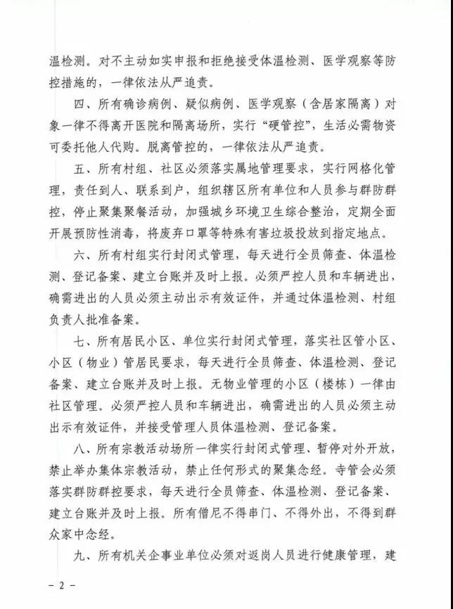 一、州域內(nèi)所有人員必須以高度的責(zé)任感自覺(jué)遵守國(guó)家和省、州出臺(tái)的疫情防控規(guī)定。二、所有人員一律不串門(mén)、不集聚,盡量不外出,確需外出的必須佩戴口罩、接受體溫檢測(cè)。出現(xiàn)發(fā)熱、咳嗽、乏力等可疑癥狀的,必須佩戴口罩立即就地就近就診并向所在村組(社區(qū))、單位報(bào)告。倡導(dǎo)每戶(hù)家庭(居家隔離家庭除外)每?jī)商熘概?名家庭成員外出采購(gòu)生活必需物資。三、所有進(jìn)州、返州人員,必須在一小時(shí)內(nèi)主動(dòng)向居(暫)住地村組(社區(qū))或所在單位如實(shí)報(bào)告近14天旅居史,并接受體溫檢測(cè)。對(duì)不主動(dòng)如實(shí)申報(bào)和拒絕接受體溫檢測(cè)、醫(yī)學(xué)觀察等防控措施的,一律依法從嚴(yán)追責(zé)。四、所有確診病例、疑似病例、醫(yī)學(xué)觀察(含居家隔離)對(duì)象一律不得離開(kāi)醫(yī)院和隔離場(chǎng)所,實(shí)行“硬管控”,生活必需物資可委托他人代購(gòu)。脫離管控的,一律依法從嚴(yán)追責(zé)。五、所有村組、社區(qū)必須落實(shí)屬地管理要求,實(shí)行網(wǎng)格化管理,責(zé)任到人、聯(lián)系到戶(hù),組織轄區(qū)所有單位和人員參與群防群控,停止聚集聚餐活動(dòng),加強(qiáng)城鄉(xiāng)環(huán)境衛(wèi)生綜合整治,定期全面開(kāi)展預(yù)防性消毒,將廢棄口罩等特殊有害垃圾投放到指定地點(diǎn)。六、所有村組實(shí)行封閉式管理,每天進(jìn)行全員篩查、體溫檢測(cè)、登記備案、建立臺(tái)賬并及時(shí)上報(bào)。必須嚴(yán)控人員和車(chē)輛進(jìn)出,確需進(jìn)出的人員必須主動(dòng)出示有效證件,并通過(guò)體溫檢測(cè)、村組負(fù)責(zé)人批準(zhǔn)備案。七、所有居民小區(qū)、單位實(shí)行封閉式管理,落實(shí)社區(qū)管小區(qū)、小區(qū)(物業(yè))管居民要求,每天進(jìn)行全員篩查、體溫檢測(cè)、登記備案、建立臺(tái)賬并及時(shí)上報(bào)。無(wú)物業(yè)管理的小區(qū)(樓棟)一律由社區(qū)管理。必須嚴(yán)控人員和車(chē)輛進(jìn)出,確需進(jìn)出的人員必須主動(dòng)出示有效證件,并接受管理人員體溫檢測(cè)、登記備案。八、所有宗教活動(dòng)場(chǎng)所一律實(shí)行封閉式管理、暫停對(duì)外開(kāi)放,禁止舉辦集體宗教活動(dòng),禁止任何形式的聚集念經(jīng)。寺管會(huì)必須落實(shí)群防群控要求,每天進(jìn)行全員篩查、體溫檢測(cè)、登記備案、建立臺(tái)賬并及時(shí)上報(bào)。所有僧尼不得串門(mén)、不得外出,不得到群眾家中念經(jīng)。九、所有機(jī)關(guān)企事業(yè)單位必須對(duì)返崗人員進(jìn)行健康管理,建立管理臺(tái)賬,并向所在社區(qū)(村組)報(bào)備,對(duì)確認(rèn)無(wú)可疑癥狀的準(zhǔn)予返崗工作。單位食堂必須規(guī)范管理,實(shí)行分散就餐。十、非居民生活必需的公共場(chǎng)所一律關(guān)閉,經(jīng)批準(zhǔn)營(yíng)業(yè)的公共場(chǎng)所中央空調(diào)一律關(guān)停。商場(chǎng)、超市、賓館、飯店、農(nóng)貿(mào)市場(chǎng)、公共客運(yùn)、個(gè)體商戶(hù)等市場(chǎng)經(jīng)營(yíng)主體必須嚴(yán)格落實(shí)疫情防控措施,每天開(kāi)展預(yù)防性消毒工作,從業(yè)和進(jìn)入人員一律佩戴口罩、檢測(cè)體溫、備案登記。藥店、診所、村衛(wèi)生室出售退燒、咳嗽類(lèi)藥品必須實(shí)名制登記,并每日上報(bào)轄區(qū)疾控部門(mén),對(duì)近14天有重點(diǎn)疫區(qū)旅居史的立即上報(bào)。快遞、外賣(mài)實(shí)行無(wú)接觸配送。十一、車(chē)站、機(jī)場(chǎng)和交通檢疫站點(diǎn)實(shí)行進(jìn)出人員全覆蓋體溫檢測(cè)和登記備案制度,對(duì)體溫異常人員立即采取就地就近隔離觀察。對(duì)拒絕配合的,公安機(jī)關(guān)依法協(xié)助強(qiáng)制執(zhí)行;對(duì)妨害執(zhí)行公務(wù)的,公安機(jī)關(guān)依法從嚴(yán)從重處理。十二、廣大黨員、干部、各級(jí)人大代表、政協(xié)委員要發(fā)揮帶頭作用,嚴(yán)格管好家人和親屬,積極主動(dòng)參與疫情防控工作,帶動(dòng)街坊鄰居自覺(jué)遵守相關(guān)規(guī)定。 本公告自發(fā)布之日起實(shí)施,終止日期另行公告。 甘孜州應(yīng)對(duì)新型冠狀病毒感染肺炎疫情應(yīng)急指揮部
