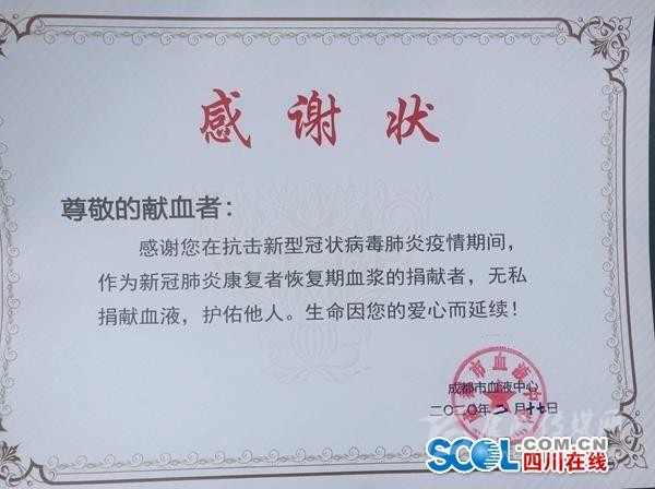 “出院的時(shí)候,我特地與我的主治醫(yī)生說,有相關(guān)的血液捐贈或者其他配合的需求請隨時(shí)聯(lián)系我!”35歲的捐獻(xiàn)者李某表示,這是我首次獻(xiàn)血,我是湖北武漢人,有親戚朋友在成都,當(dāng)作成都是第二故鄉(xiāng),我是1月22日到成都探親,23日下午發(fā)熱在成都市公共衛(wèi)生臨床醫(yī)療中心確診和治療,2月6日出院。在出院治療期間,李某表示,最難忘的就是每次醫(yī)生來查房,都會鼓勵我說,放心你一定會康復(fù)的,“我難忘成都這份恩情!”