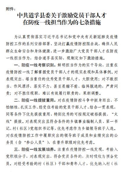 疾風(fēng)知?jiǎng)挪荩迨幾R(shí)誠(chéng)臣。自新型冠狀病毒肺炎疫情防控阻擊戰(zhàn)打響以來(lái),道孚縣各級(jí)黨組織和黨員、干部主動(dòng)擔(dān)當(dāng)作為,積極投入疫情防控最前線,為有力防控疫情蔓延作出重要貢獻(xiàn)。近日,道孚縣委印發(fā)《中共道孚縣委關(guān)于激勵(lì)黨員干部人才在防疫一線擔(dān)當(dāng)作為的七條措施》,關(guān)心關(guān)愛(ài)、激勵(lì)引導(dǎo)廣大黨員、干部、各類人才在疫情防控一線履職盡責(zé)、擔(dān)當(dāng)作為、安心戰(zhàn)斗。