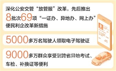 公安交管“跨省通辦”改革深入推進(jìn),駕駛證“全國通考”、機(jī)動(dòng)車“全國通檢”等改革措施全面落地,已有9000多萬群眾享受到跨省異地考試、車檢、補(bǔ)換證、處理交通違法等便利,減少多次往返,更好適應(yīng)人員、貨物、車輛大流動(dòng)的新形勢(shì)。