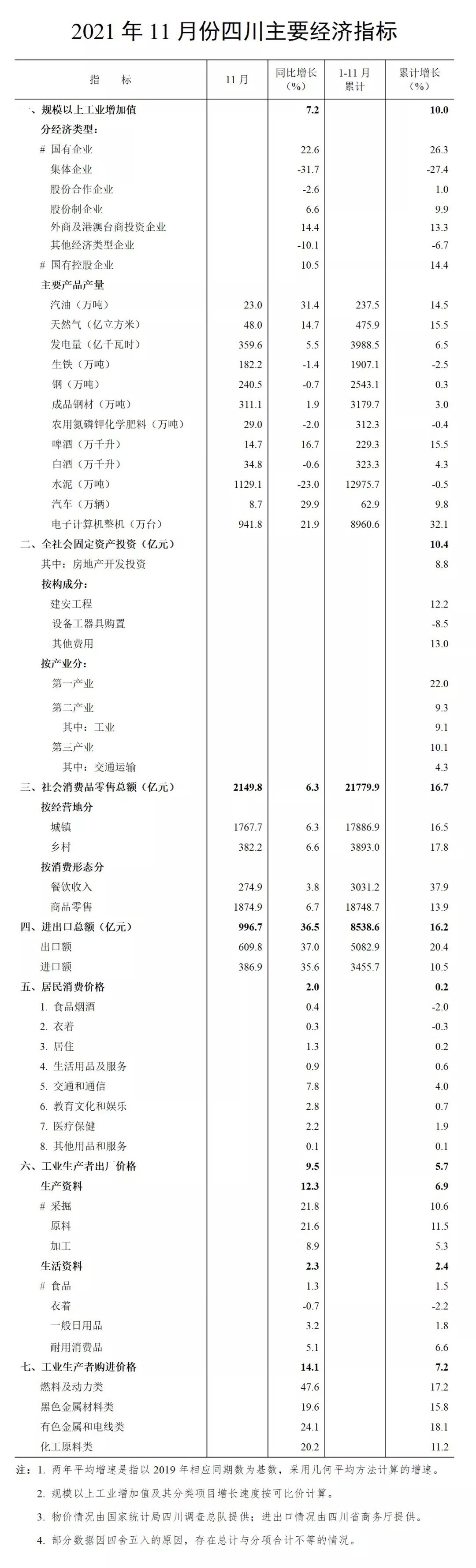 12月16日,四川省統(tǒng)計(jì)局官微發(fā)布《2021年1-11月四川省國(guó)民經(jīng)濟(jì)主要指標(biāo)數(shù)據(jù)》,具體如下: