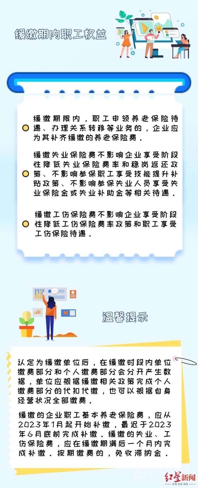 此外,為進(jìn)一步加強職工權(quán)益保障,《通知》還明確,緩繳企業(yè)要依法履行代扣代繳職工個人繳費義務(wù),不得因緩繳社會保險費,影響職工個人權(quán)益。企業(yè)原則上應(yīng)在緩繳期滿后的一個月內(nèi)補繳緩繳的失業(yè)保險、工傷保險費款;緩繳的企業(yè)職工基本養(yǎng)老保險費,應(yīng)從2023年1月起開始補繳,最遲于2023年6月底前補繳到位,期間免收滯納金。企業(yè)可根據(jù)實際需要,提前申報繳納緩繳的費款,稅務(wù)部門應(yīng)及時征收。緩繳的企業(yè)出現(xiàn)注銷等情形的,應(yīng)在注銷前繳納緩繳的費款,相關(guān)部門按照注銷流程及時辦理。