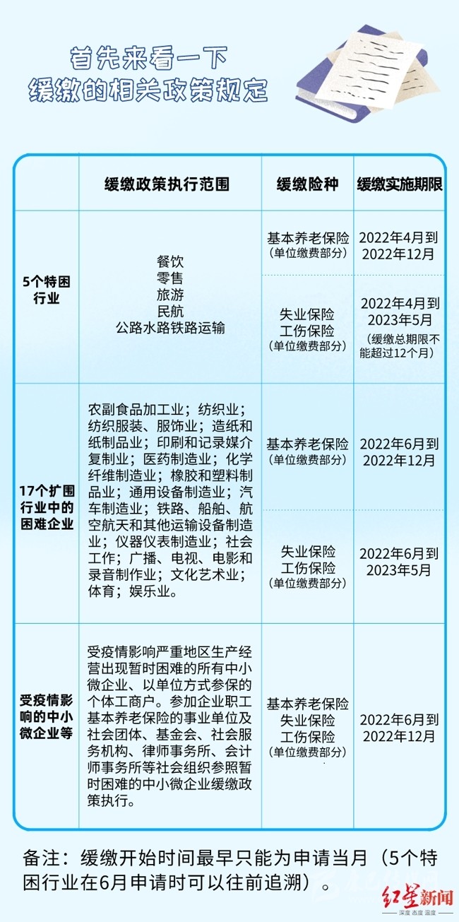 在緩繳期限方面,對餐飲等5個特困行業(yè)緩繳養(yǎng)老保險費期限延長至2022年12月31日。對17個緩繳擴(kuò)圍行業(yè)所屬困難企業(yè),養(yǎng)老保險費緩繳實施期限至2022年12月31日,工傷、失業(yè)保險費緩繳期限不超過1年。緩繳期間免收滯納金。