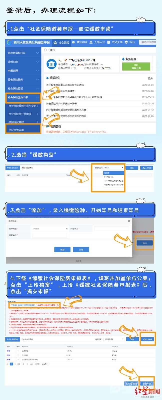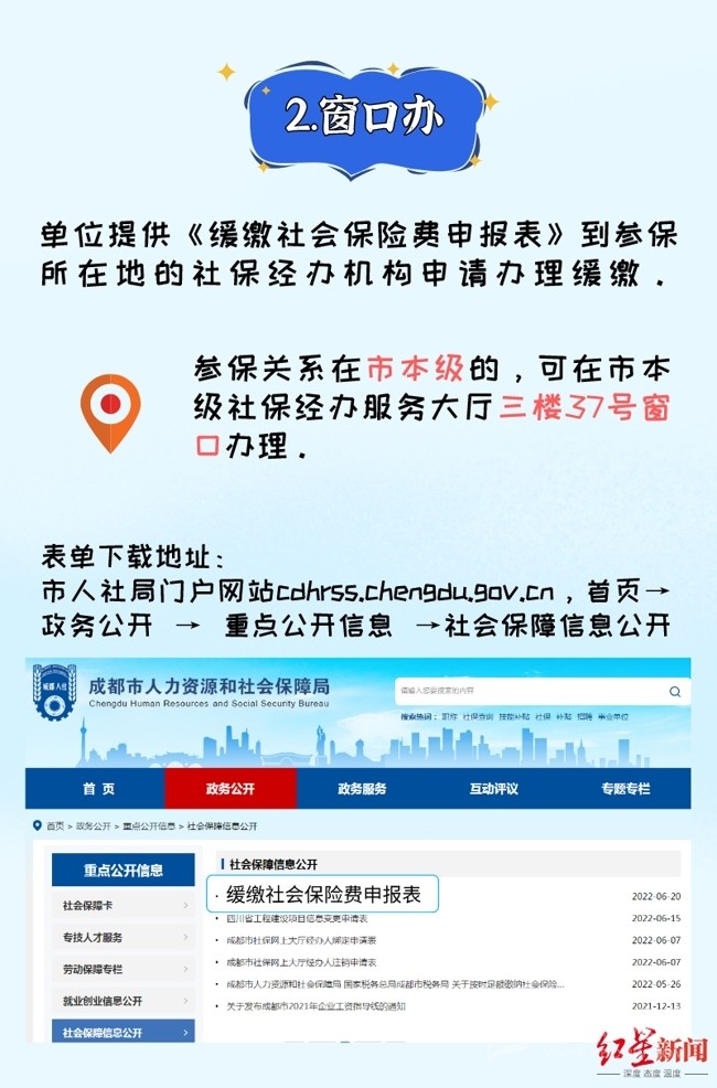 7月26日,紅星新聞記者從成都市人社局獲悉,今年6月,四川省人社廳、省發(fā)改委、省財政廳、省稅務(wù)局聯(lián)合出臺的《關(guān)于擴(kuò)大階段性緩繳社會保險費政策實施范圍等問題的通知》,明確了延長階段性減免企業(yè)基本養(yǎng)老保險、失業(yè)保險、工傷保險單位繳費政策實施期限,同時將階段性緩繳社會保險費政策擴(kuò)圍至22個行業(yè)。