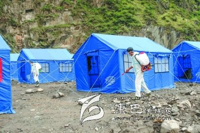 衛(wèi)生防疫人員對安置點進(jìn)行消毒。