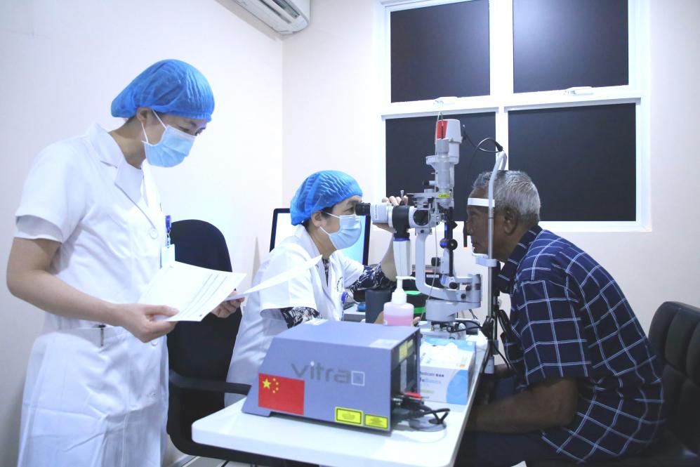 ??2023年2月4日,在馬爾代夫首都馬累附近的胡魯馬累醫(yī)院,中國-馬爾代夫眼科中心中方專家為當?shù)鼗颊咦鲅劭茩z查。