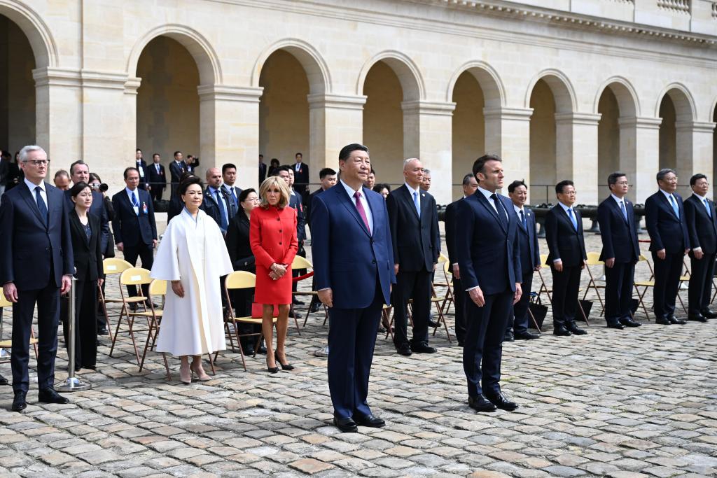 ??當(dāng)天下午,習(xí)近平在巴黎出席馬克龍舉行的隆重盛大歡迎儀式。兩國(guó)元首檢閱法蘭西共和國(guó)衛(wèi)隊(duì)和陸??杖妰x仗隊(duì),并觀看分列式。