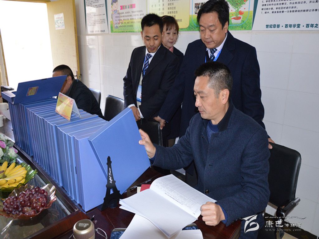 圖為檢查組一行在城區(qū)第一小學(xué)查閱資料。