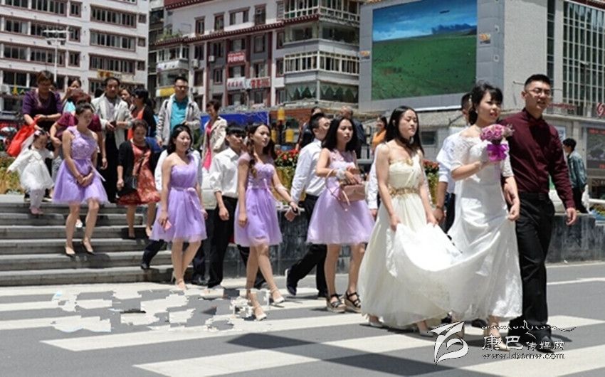 本網(wǎng)訊(吳小軍 李向雨)8月8日,記者在甘孜州康定市中心折多河邊看到一對(duì)身著新婚盛裝的新人通過步行的方式完成他們的迎親儀式。迎親全程沒有一輛婚車,新郎新娘、伴郎伴娘以及30多位親友從家出發(fā)沿折多河人行道集體步行抵達(dá)康定情歌大酒店婚禮現(xiàn)場(chǎng)。和以往長(zhǎng)長(zhǎng)的繞街串巷的婚車隊(duì)相比,這支獨(dú)特的步行迎親隊(duì)伍更加引人注目,瞬間成為一道亮麗的風(fēng)景線,引起市民、游客紛紛圍觀拍照。