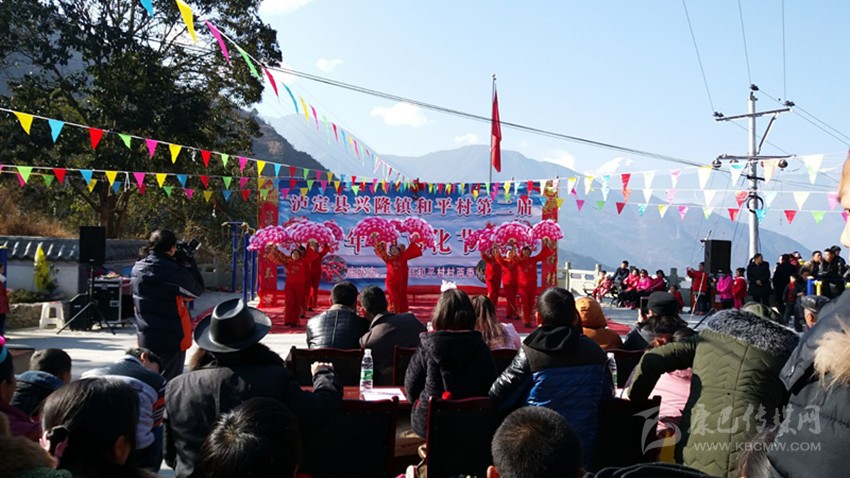鼓聲喧天、歌聲飛揚(yáng),現(xiàn)場(chǎng)到處洋溢著濃濃的節(jié)日氛圍。浩浩蕩蕩的隊(duì)伍也引來(lái)了不少村民和游客們的關(guān)注。特別是隊(duì)伍中幾個(gè)唱山歌的村民獨(dú)特的腔調(diào)和唱詞盡展和平村山歌的特色。和平村每到冬月以后,村民家家戶戶便開始?xì)⒛曦i,相互串門,吃年豬宴,這一習(xí)俗已傳承百年,在和平村村民的心中,年豬文化節(jié)是一個(gè)慶祝豐收的節(jié)日。上午十點(diǎn)半,游行隊(duì)伍來(lái)到了和平村村級(jí)活動(dòng)室,“豬王”被放在了舞臺(tái)中間,焚香祈福后,當(dāng)?shù)卮迕裼幂d歌載舞的方式共慶這一節(jié)日的成功舉辦。村民們自編自演的舞蹈《祖國(guó)您好》《喜慶臨門》《紅梅贊》,現(xiàn)場(chǎng)表演唱山歌打草鞋,每一支舞,每一首歌都傳遞著村民們對(duì)黨對(duì)祖國(guó)對(duì)新生活的無(wú)限熱愛。