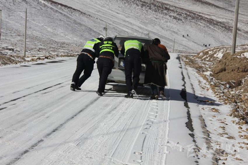 石渠縣公安局交警大隊(duì)民警大年三十巡邏時幫助群眾推車 獲群眾好評。