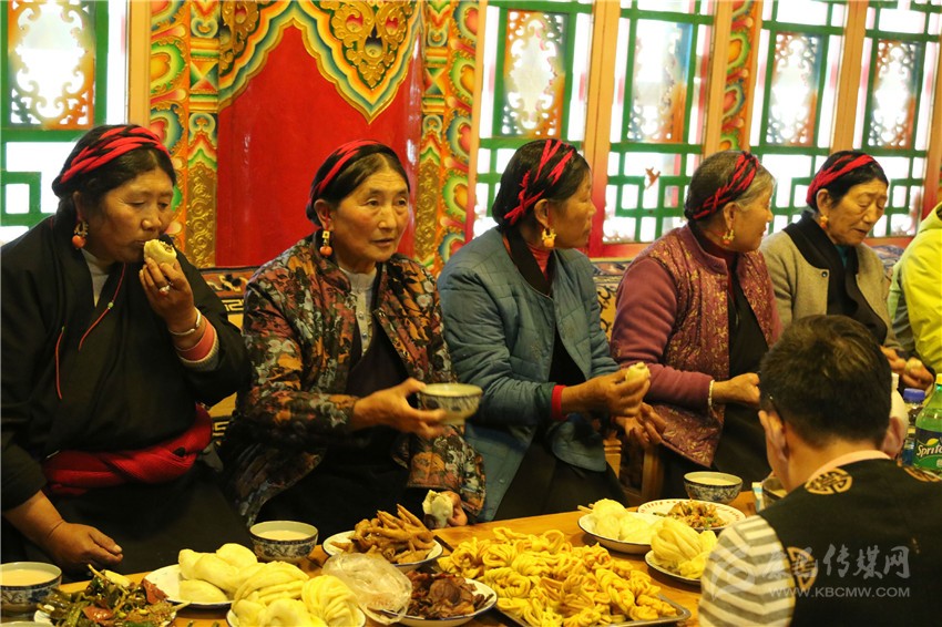 下午3點,果子、各種菜品、熱騰騰的包子端上來了,各種飲料擺滿桌子,親朋好友十余口人聚在澤絨多吉的新家中,端起最愛的瓊(用青稞釀成的酒),在歡歌笑語中迎接藏歷火雞新年的到來。