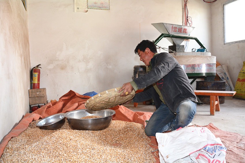 事實(shí)上,小作坊的準(zhǔn)確名稱(chēng)是仁果下村電磨坊合作社,屬于村里的集體經(jīng)濟(jì),廠房的建設(shè)、機(jī)器的購(gòu)買(mǎi)都來(lái)源于扶貧專(zhuān)項(xiàng)資金。建成后,合作社提供崗位,讓村里的貧困戶來(lái)操作運(yùn)營(yíng)。于是,洛桑降措成為了這里的“主人”。