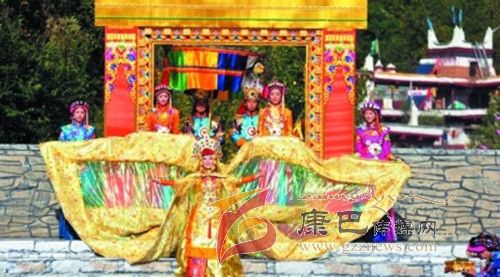 在催人奮進(jìn)的戰(zhàn)鼓聲中,一群身披甲胄的士兵拿著長劍,背著巨弓走到臺前,在鏗鏘的戰(zhàn)鼓聲中,戰(zhàn)士們做著各種競技動作,模仿武士們互相攻擊的樣子,那矯健的身影展示了遠(yuǎn)古時代嘉絨藏族先民們?yōu)榱松媾c自然努力抗?fàn)幍膱鼍?。過了一會兒音樂一轉(zhuǎn),戰(zhàn)鼓聲漸漸減弱,在鳥雀的陣陣啾啾聲中,一座木門慢慢的開啟,一位身披長袍、頭戴鳳冠的女王在眾多美女的簇?fù)硐?,緩緩走下臺階步入舞臺中央,此時,一位手捧托盤的老者來到女王面前單膝下跪,將托盤高舉過頂,并邀請女王品嘗佳肴,女王將中指在酒中蘸了蘸,并曲起中指向四周輕輕彈去,寓意愿將杯中美酒與四方百姓同飲。在女王面前還放置著一個凈水桶,桶中盛滿了清澈的甘泉,桶上橫放著一枝柏樹枝,女王伸出纖纖玉手,拿著柏樹枝在水中蘸了蘸,面向墨爾多神山撒去,寓意向神山祈福。這是此次《美人谷·丹巴》節(jié)目展演中的序曲部分,有著強(qiáng)烈的東女神韻,將遠(yuǎn)古時代東女國女王遺風(fēng)展演的淋漓盡致。