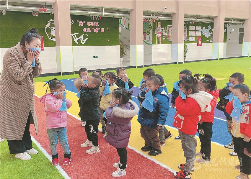 圖為該縣高城鎮(zhèn)幼兒園老師正在示范引導(dǎo)孩子學(xué)習(xí)防火技能。