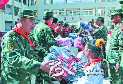 儀式上,8722部隊向學校贈送了價值萬余元的學習用品,拿著裝有鉛筆、水彩筆等各種文具的“愛心書包”,孩子們興奮不已。12歲的藏族女生登真啟珍告訴筆者:“今年的‘六一’兒童節(jié),武警部隊的叔叔們專門來看望我們,還送來了禮物,我感到特別開心。”儀式上,少先隊員們給參加慰問的部隊領導戴上鮮艷的紅領巾,孩子們還表演了精心排練的節(jié)目。一張張燦爛的笑臉,一陣陣蕩漾心扉的歌聲,傳遞著駐訓武警部隊與當?shù)厝罕姖鉂獾聂~水深情。