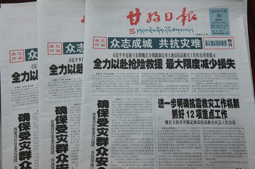 又訊 此外,自康定地震發(fā)生以來(lái),本報(bào)藏漢文報(bào)廣大編采人員發(fā)揚(yáng)連續(xù)作戰(zhàn)的精神,已經(jīng)連續(xù)9天不分白天黑夜地工作,保證了一線有記者的身影,后方編輯及時(shí)發(fā)聲,截止30日,本報(bào)藏漢文報(bào)已經(jīng)出版13期《眾志成城  共抗災(zāi)難》專刊和一期特刊,共計(jì)72個(gè)版面;本報(bào)《康巴傳媒網(wǎng)》自開(kāi)辦網(wǎng)站以來(lái),首次實(shí)現(xiàn)了網(wǎng)站信息即時(shí)更新、滾動(dòng)發(fā)布,網(wǎng)站日上稿量超過(guò)100條,日點(diǎn)擊量均超過(guò)10萬(wàn)人次;本報(bào)微信平臺(tái)則采用短平快的方式,第一時(shí)間發(fā)布最新資訊,引導(dǎo)公眾情緒,傳播黨委政府的聲音,微信日點(diǎn)擊和轉(zhuǎn)發(fā)量超過(guò)2萬(wàn)人次;除此之外,本報(bào)承辦的手機(jī)報(bào)也發(fā)揮了巨大的作用。