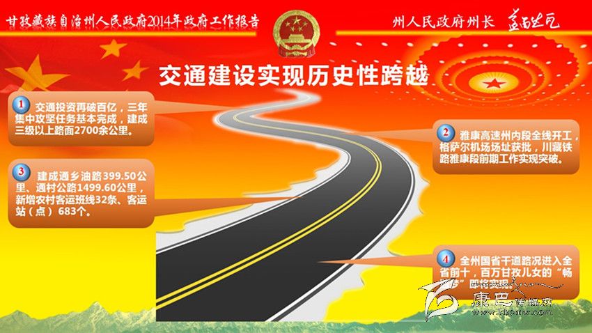 交通建設(shè)實現(xiàn)歷史性跨越。交通投資再破百億,建成三級以上路面2700余公里。雅康高速州內(nèi)段全線開工,格薩爾機(jī)場場址獲批,川藏鐵路雅康段前期工作實現(xiàn)突破。建成通鄉(xiāng)油路399.5公里、通村公路1499.6公里,新增農(nóng)村客運班線32條、客運站(點) 683個。全州國省干道路況進(jìn)入全省前十。徹底告別無電鄉(xiāng)歷史。完成投資100億元,“電力天路”等項目順利實施,“川藏聯(lián)網(wǎng)” 工程提前半年建成投運;18個縣實現(xiàn)與主網(wǎng)連網(wǎng);“遠(yuǎn)村點亮”全面完成。城鄉(xiāng)面貌煥然一新。堅持建好縣城,全州市政基礎(chǔ)設(shè)施有效提升。堅持做大集鎮(zhèn),改造小城鎮(zhèn)危舊房1118戶;投入1.34億元完善姑咱、馬尼干戈、香格里拉、八美4個省級“百鎮(zhèn)試點”鎮(zhèn)市政設(shè)施,13個鄉(xiāng)獲準(zhǔn)撤鄉(xiāng)建鎮(zhèn)。堅持做美村寨,成功創(chuàng)建45個省級“美麗鄉(xiāng)村”示范村,19個州級幸福美麗新村試點建設(shè)全面啟動,打造新村聚居點235個,建成藏區(qū)新居1.11萬戶。全州城鎮(zhèn)化率達(dá)到27%。通信覆蓋越來越廣。完成投資4.53億元,國省干線和主要旅游景區(qū)通信網(wǎng)絡(luò)實現(xiàn)連續(xù)覆蓋。生態(tài)底色更加鮮明。編制完成《甘孜州生態(tài)文明建設(shè)規(guī)劃》,落實國家生態(tài)功能區(qū)轉(zhuǎn)移支付資金6.8億元,生態(tài)保護(hù)與建設(shè)工程加快推進(jìn),草原植被、森林覆蓋率分別達(dá)到78%、33.04%。