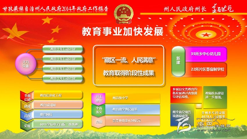 加大民生投入,全年民生支出139億元。全州城鎮(zhèn)新增就業(yè)7400人,城鄉(xiāng)低保實現(xiàn)應(yīng)保盡保;在全省民族地區(qū)率先實施醫(yī)療保險制度城鄉(xiāng)統(tǒng)籌,異地就醫(yī)即時結(jié)算全面啟動;在全省率先出臺大病醫(yī)療保險規(guī)定。教育事業(yè)加快發(fā)展。新建35所鄉(xiāng)中心幼兒園、22所片區(qū)寄宿制學(xué)校,州高級中學(xué)開工建設(shè)。全面落實教育助學(xué)惠民政策,兌現(xiàn)各類補(bǔ)助金4.58億元。城鄉(xiāng)居民基本醫(yī)保參保率達(dá)到99.13%,健康檔案建檔率達(dá)到92%;開工建設(shè)120個標(biāo)準(zhǔn)化鄉(xiāng)(鎮(zhèn))衛(wèi)生院和225個村衛(wèi)生室;衛(wèi)生信息化建設(shè)一期工程和遠(yuǎn)程會診、教學(xué)系統(tǒng)建設(shè)基本完成;兌現(xiàn)計劃生育“三項惠民制度”資金1809萬元。群眾文化生活日益豐富。建成縣“兩館”12個;開工建設(shè)州民族體育館、州農(nóng)牧民演藝培訓(xùn)中心和14個縣級全民健身中心,建成農(nóng)民體育健身工程739個;開展 “送文化下鄉(xiāng)”近千場;康巴文化研究院“四大工程”全面啟動。深入實施“百千萬康巴英才工程”,人才科技工作扎實有效。扶貧移民工作成效明顯。完成1360個貧困村、19.91萬扶貧對象立卡建檔工作;實施整村推進(jìn)63個、連片開發(fā)項目4個、彝家新寨(村)17個、索改橋23座,易地扶貧搬遷9850人,2.65萬群眾生產(chǎn)生活條件得到改善。