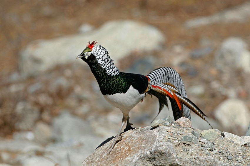 白腹錦雞(學(xué)名:Chrysolophus amherstiae):藏語譯音:甲嚇破呷妞仁 別名:銅雞、寬寬雞 國家II級保護動物,見于瀘定、康定、丹巴、九龍等。 雄鳥全長約140厘米,雌鳥約60厘米。雄鳥頭頂、背、胸為金屬翠綠色;羽冠紫紅色;后頸披肩羽白色,具黑色羽緣;下背棕色,腰轉(zhuǎn)朱紅色。飛羽暗褐色。尾羽長,有黑白相間的云狀斑紋。腹部白色。嘴和腳藍灰色。雌鳥上體及尾大部棕?